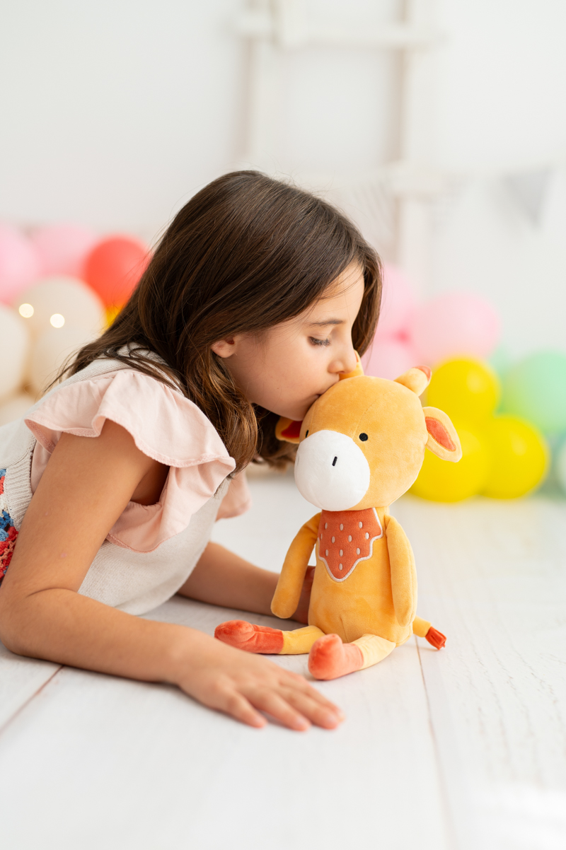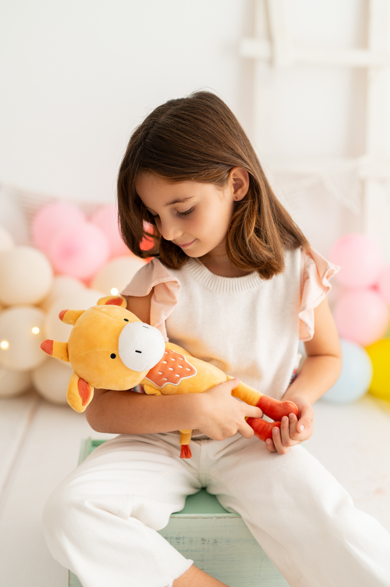 Sein zartes und warmes Design kombiniert Gelb- und Orangetöne mit einer süßen weißen Schnauze und kleinen gestickten Details, die ihm einen besonderen Charme verleihen. Seine langen Beine und der dekorative Schal verleihen ihm einen modernen und liebenswerten Stil, ideal zum Kuscheln und zur Dekoration von Kinderzimmern.