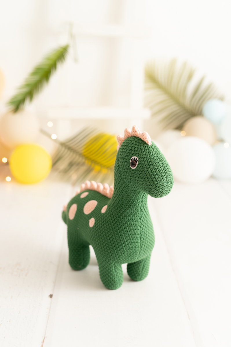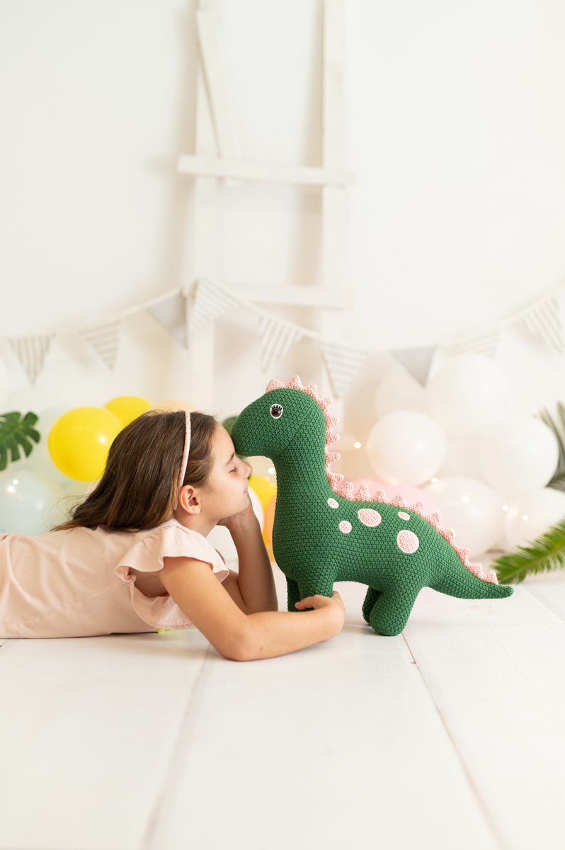 Jeder Dinosaurier wird sorgfältig aus hochwertiger Bio-Baumwolle und hypoallergener Füllung hergestellt, um Komfort und Haltbarkeit zu gewährleisten. Die gewellte Mähne, die rosa Flecken und die Häkeldetails machen dieses Plüschtier zu einem liebenswerten und robusten Begleiter.