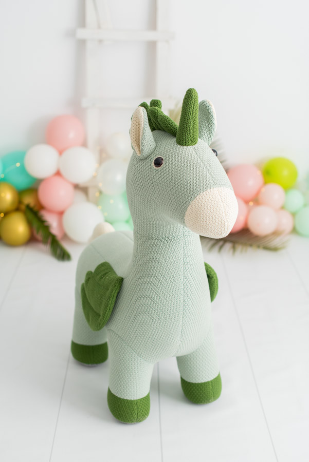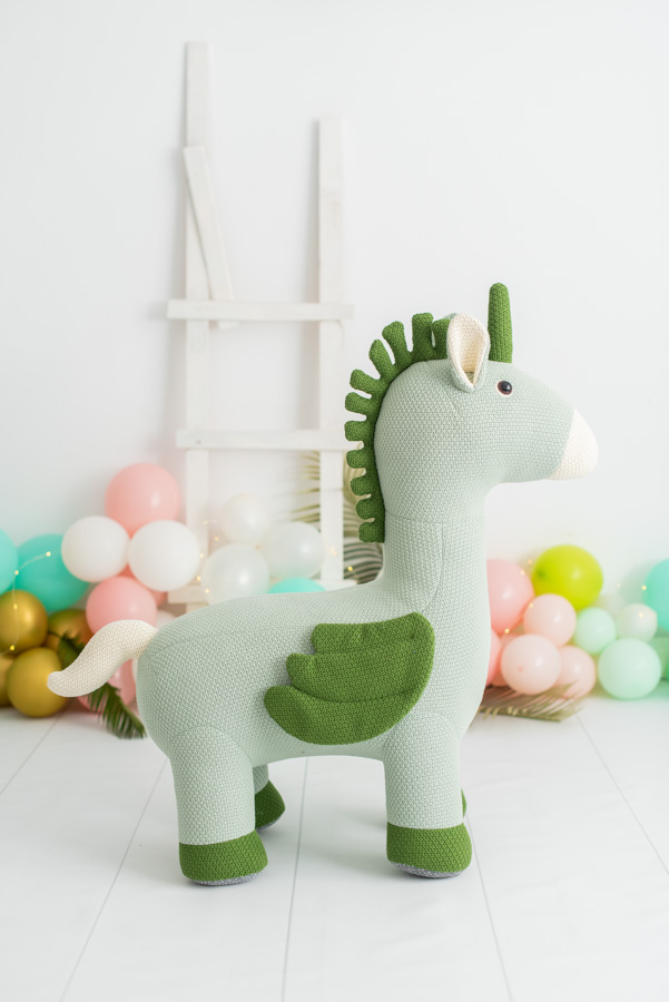 Dieser bezaubernde Pegasus ist der ideale Begleiter zum Spielen, Kuscheln oder Dekorieren und kann sogar als Sitzerhöhung verwendet werden. Sein charmanter mintgrüner Farbton und die gewebten Details erinnern an die Frische der Natur und den freien Geist des Crochetts-Universums.