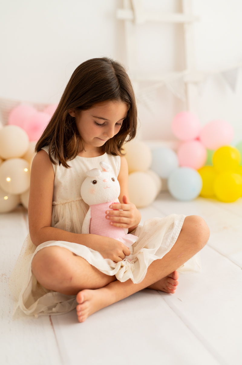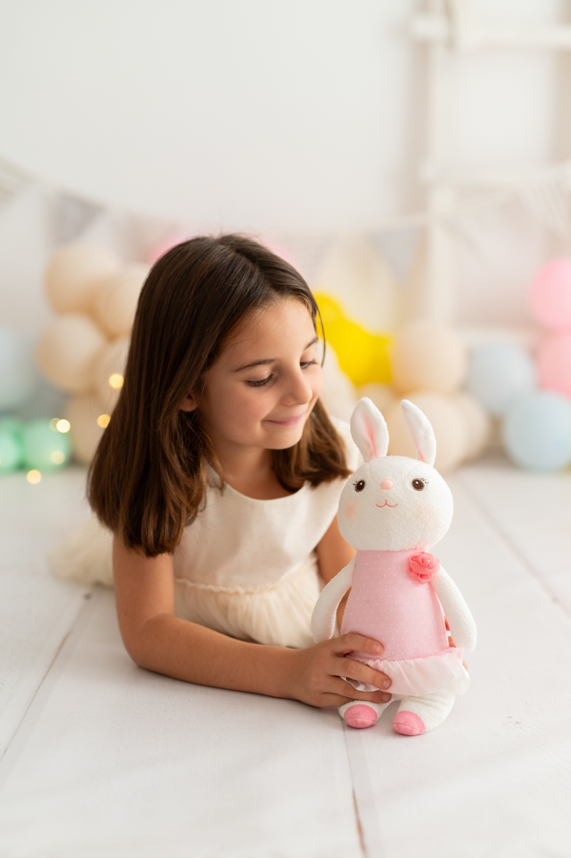 Sein niedliches und detailliertes Design kombiniert warme Rosa- und Weißtöne mit einem zart bestickten Kleid, das eine einzigartige Note voller Persönlichkeit verleiht.