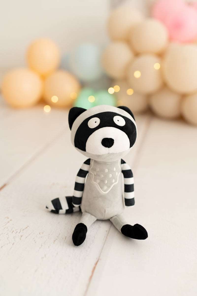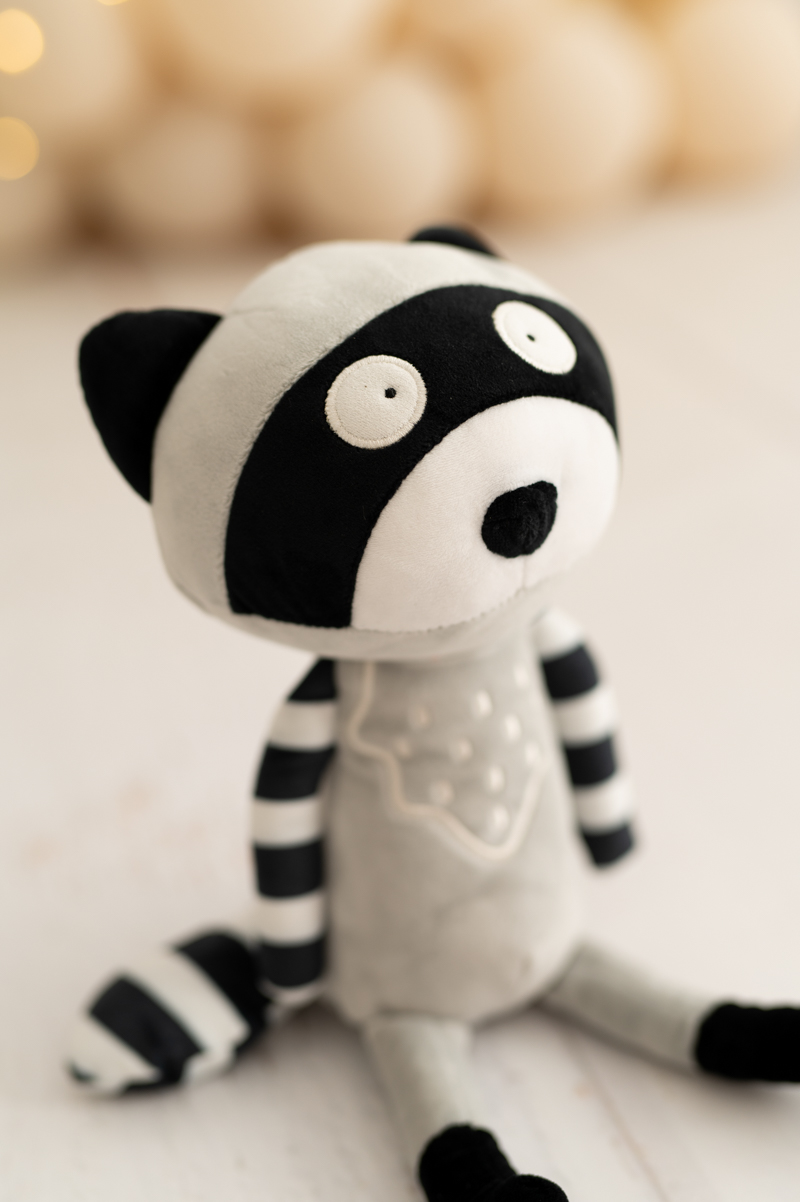 Dieser kuschelige Waschbär ist aus weichem, samtigem Stoff gefertigt, ideal, um die Kleinen in ihren Momenten der Ruhe, des Spiels und der Abenteuer zu begleiten.