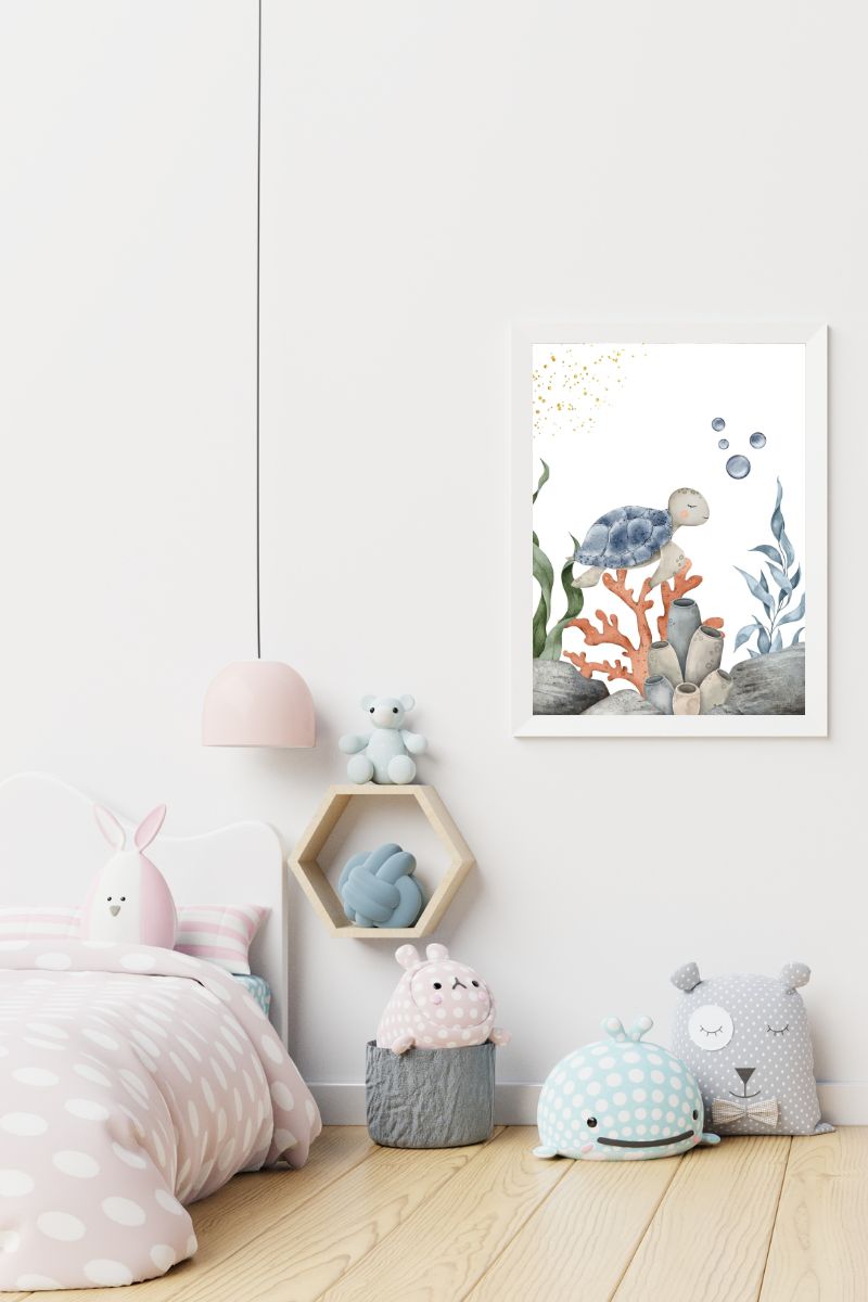 Children’s print with illustration of a small turtle at the bottom of the sea in pastel blue and gray tones.