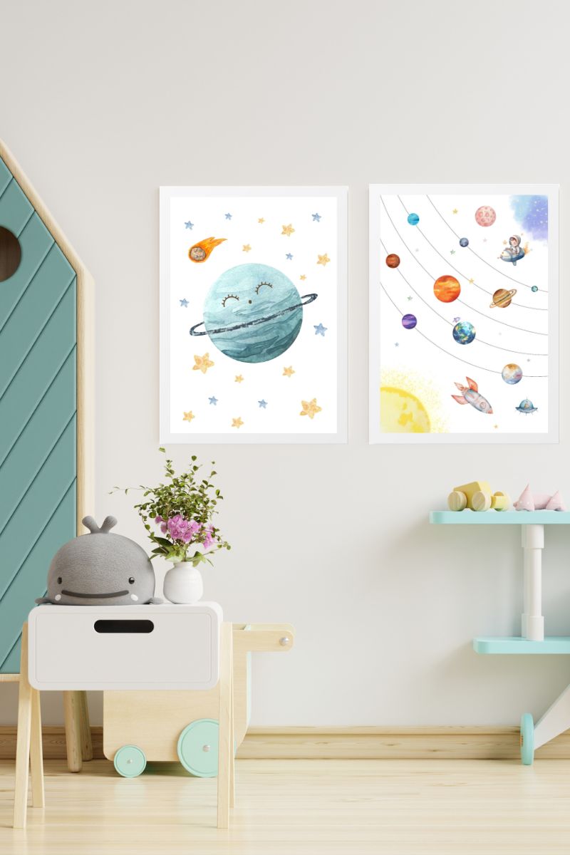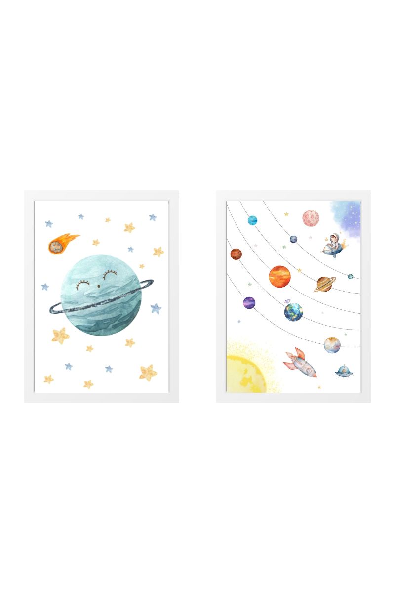 Pack of two children’s paintings with watercolor illustrations of planets and solar system.