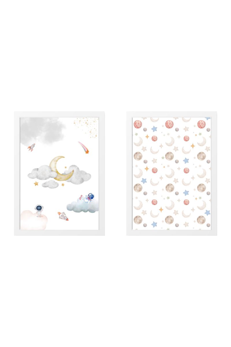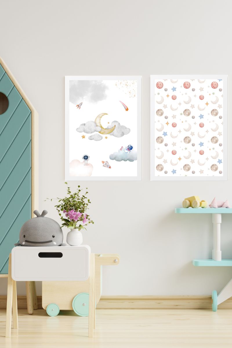 Pack of two children’s paintings with illustrations of a golden moon among clouds and planets, and another with repetitions of small moons, stars and planets in pastel tones.