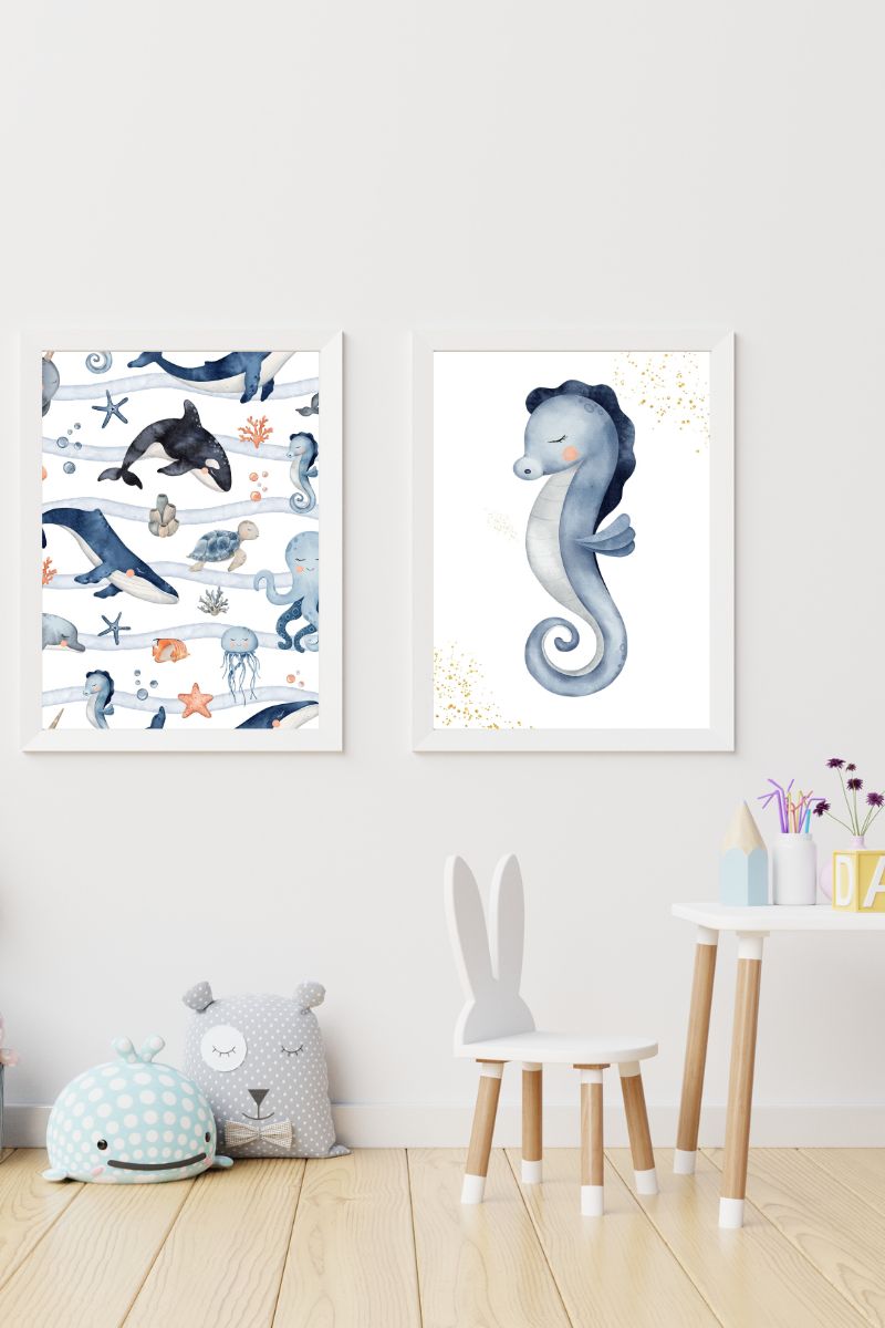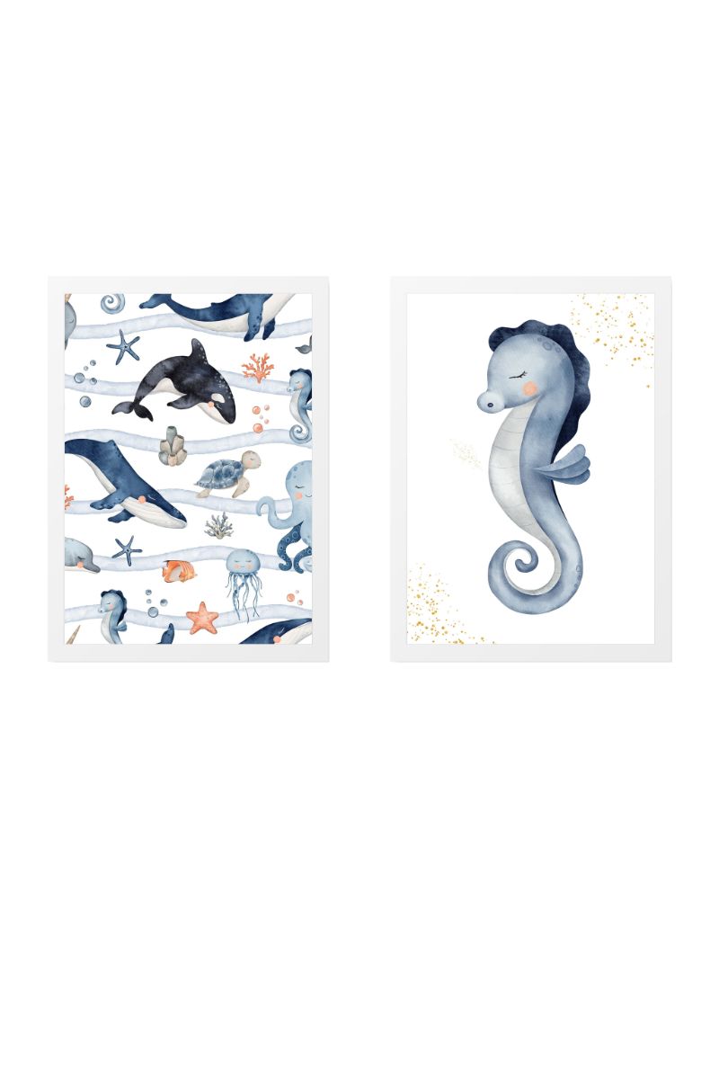 Pack of two children’s paintings with seahorse illustration in blue tones and whales with animals of the marine world with golden touches at the top and bottom that gives a touch of brightness.