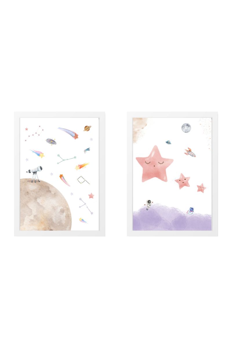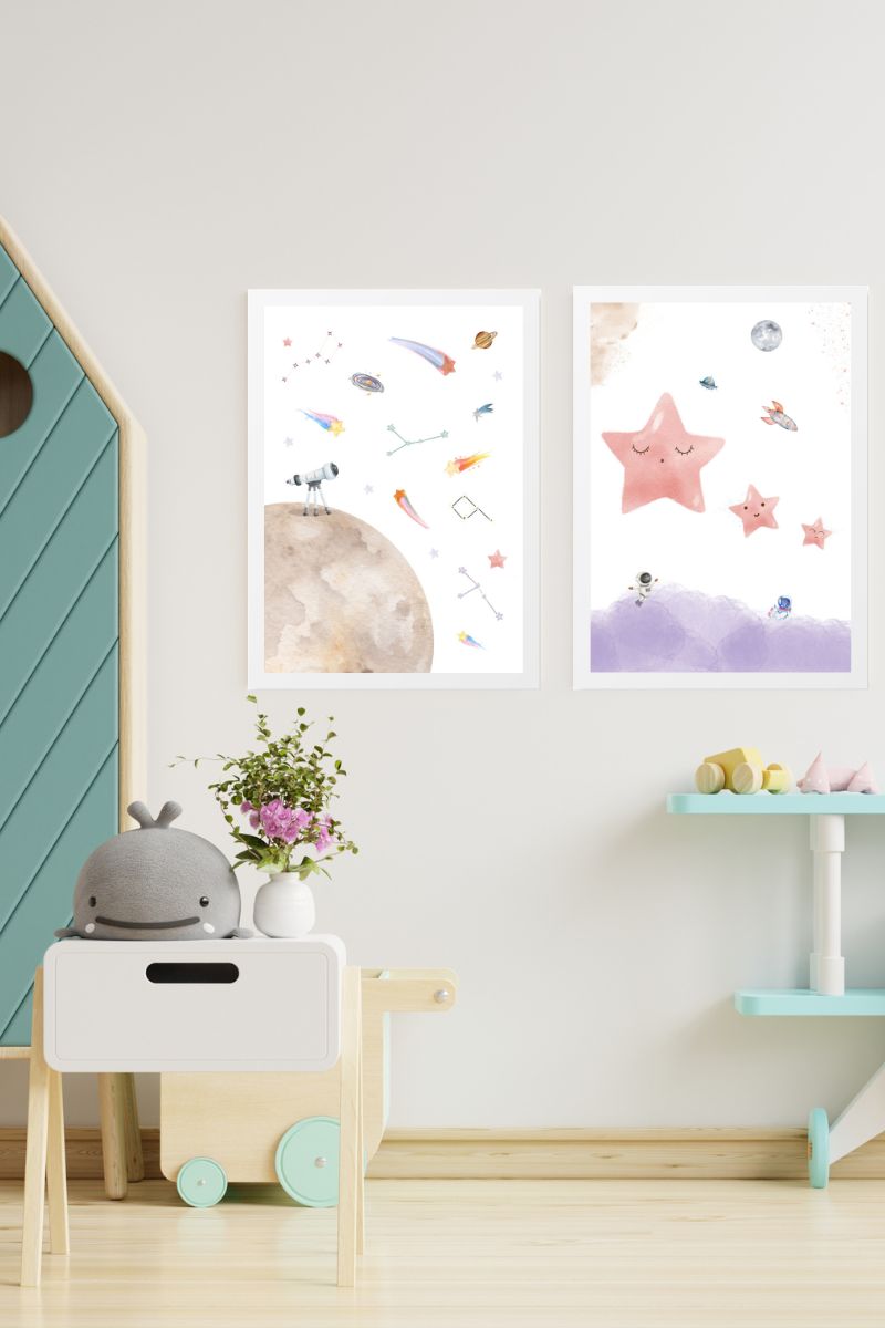Pack of two children’s paintings with illustrations of little stars sleeping in pink and shooting stars in the sky.