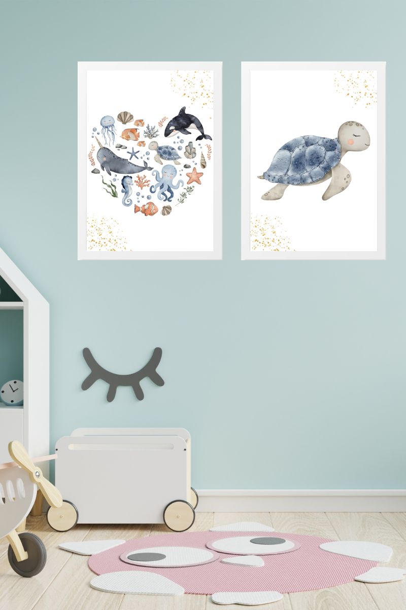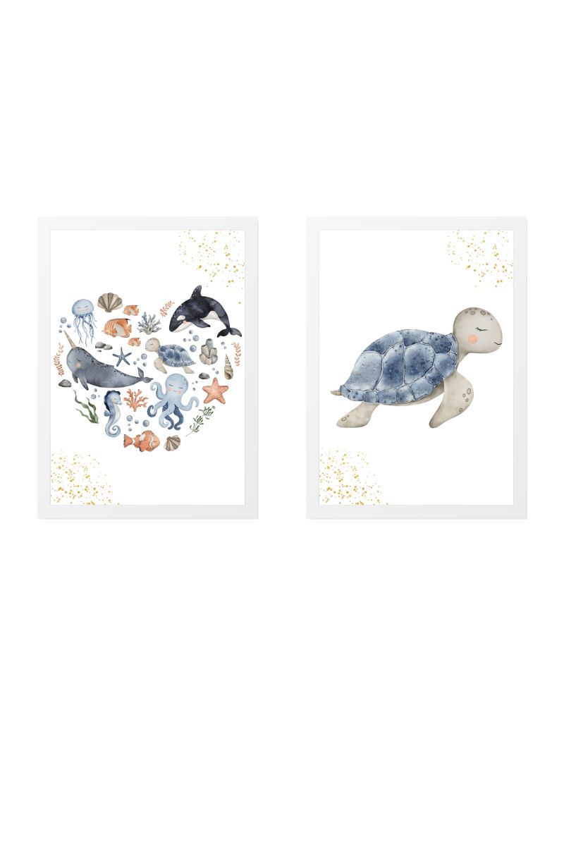 Pack of two children’s paintings with turtle illustration in pastel blue and elements of the marine world forming a beautiful heart.