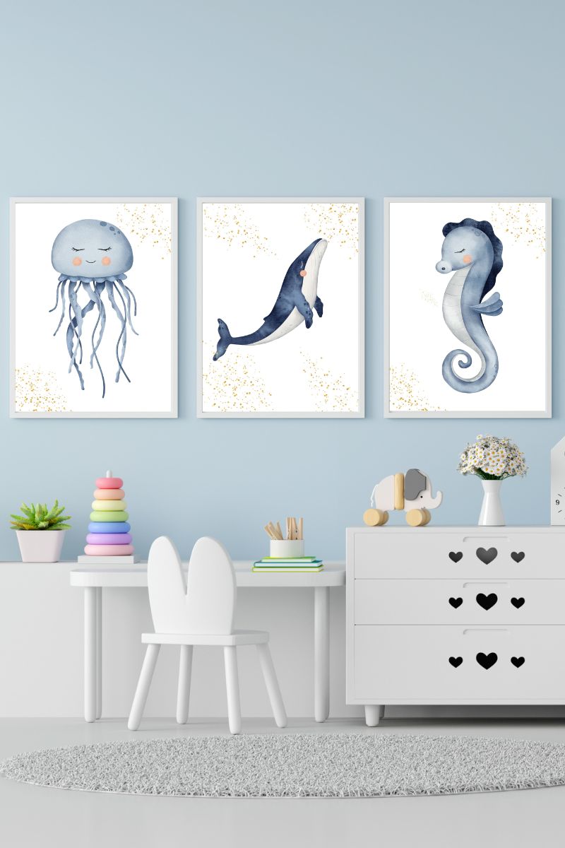 Pack of three children’s paintings with illustrations of animals of the marineworld in blue tones: jellyfish, seahorse and whale.
