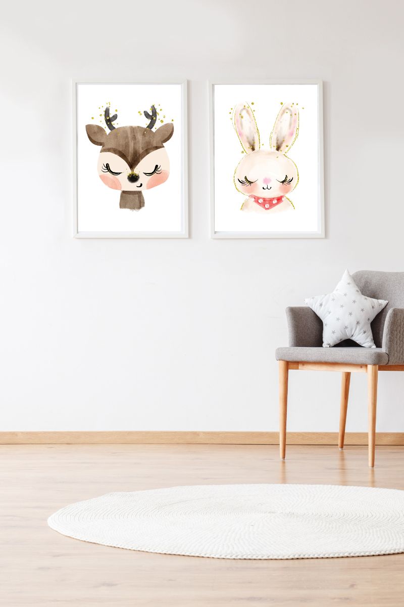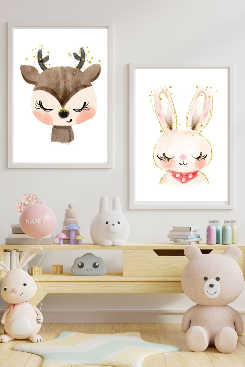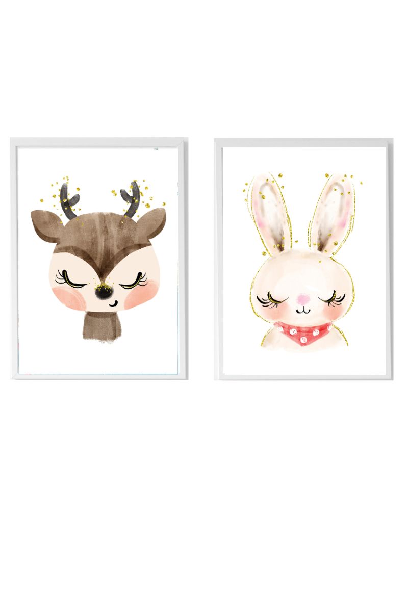 Pack of two children’s decorative prints with fawn and bunny animals motif.