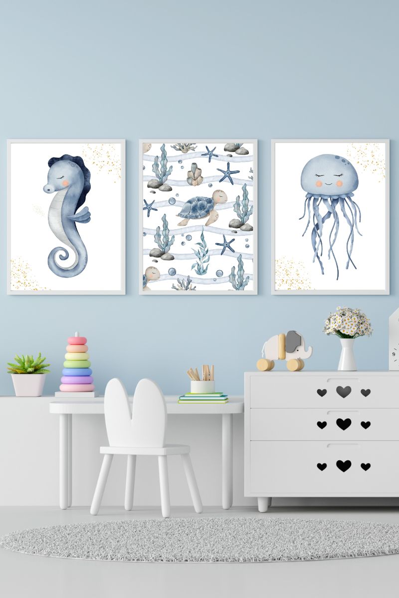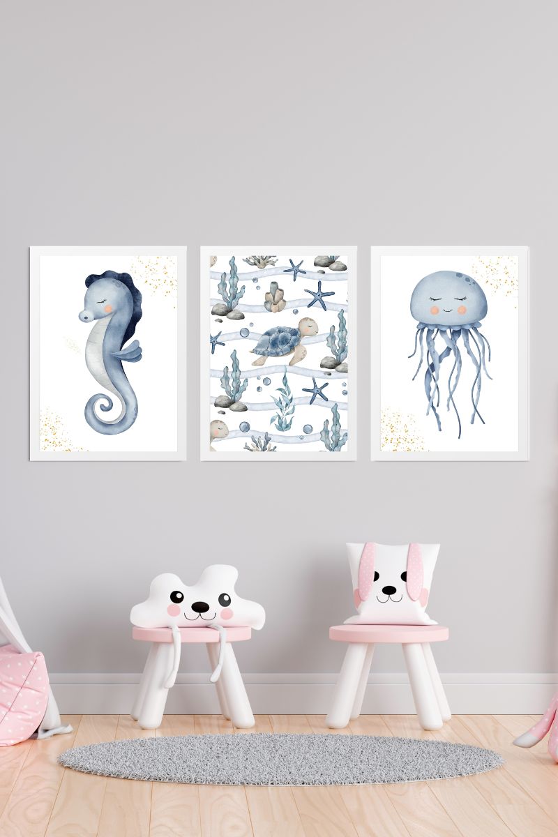 Pack of three children’s paintings with illustrations of seahorse and jellyfish and turtle swimming with marine elements.