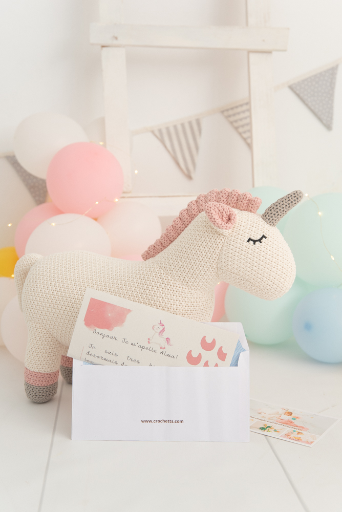 Chaque licorne est soigneusement fabriquée avec du coton biologique de haute qualité et un rembourrage hypoallergénique, garantissant confort et durabilité. Sa corne délicate et ses détails au crochet font de ce doudou un compagnon adorable et robuste.