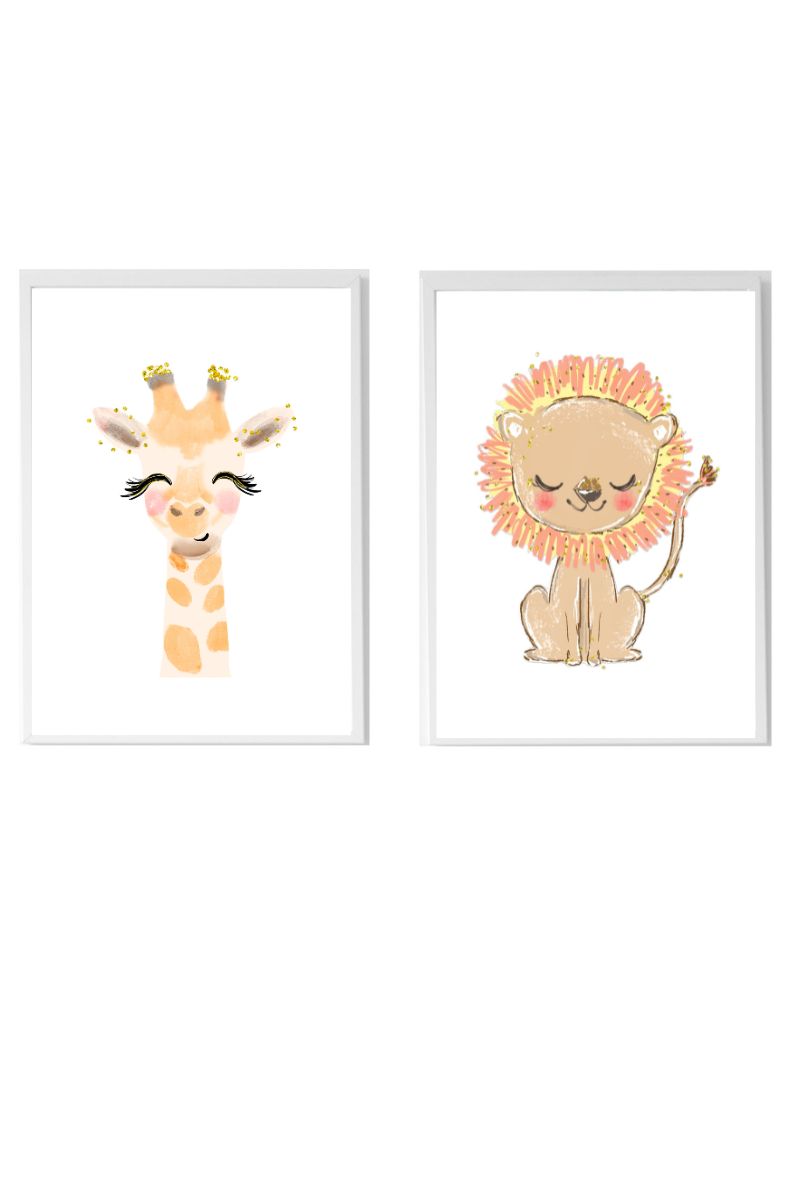 Lot de deux imprimés pour enfants représentant une jolie girafe et un adorable lion.
