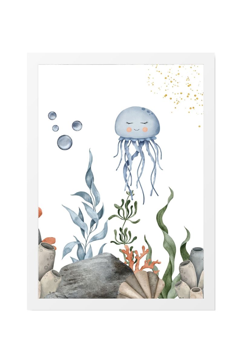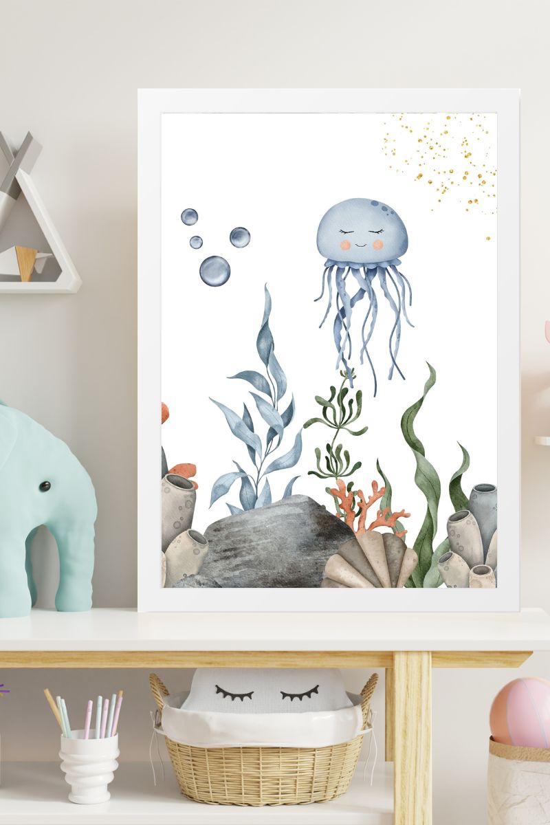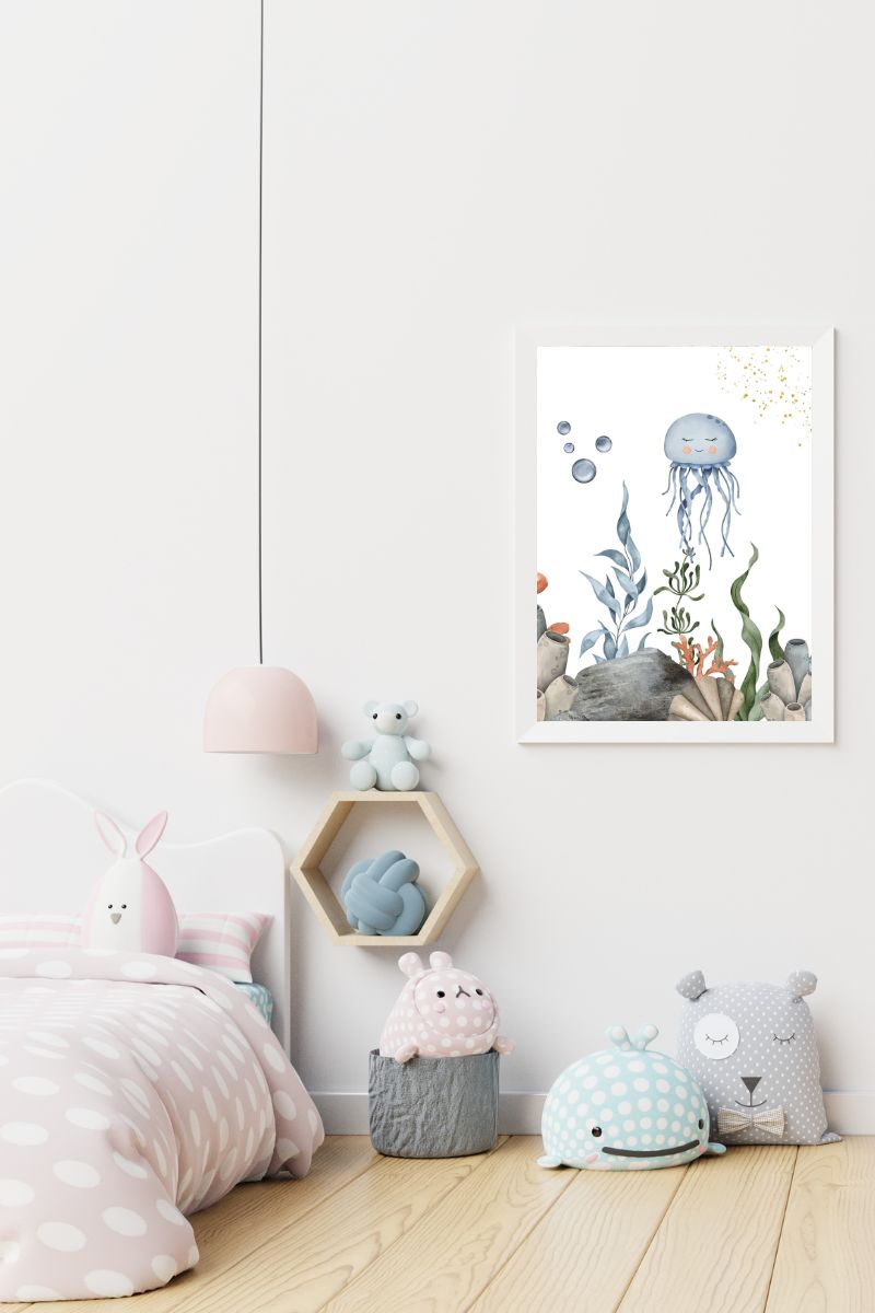 Imprimé pour enfants avec illustration de méduses dans des tons bleus doux nageant sur le fond marin.