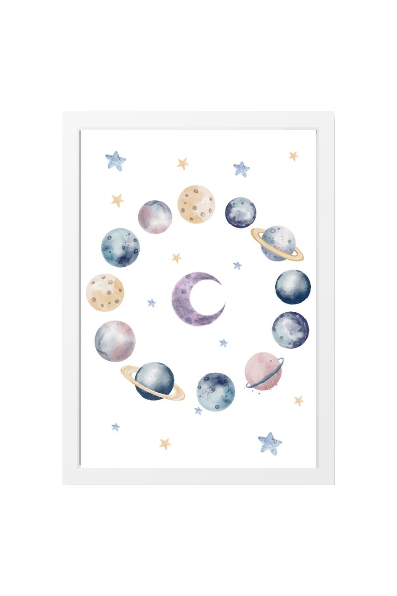 Image pour enfants avec le motif d’un spectaculaire croissant de lune accompagné en cercle par les planètes dans l’espace entre les constellations.