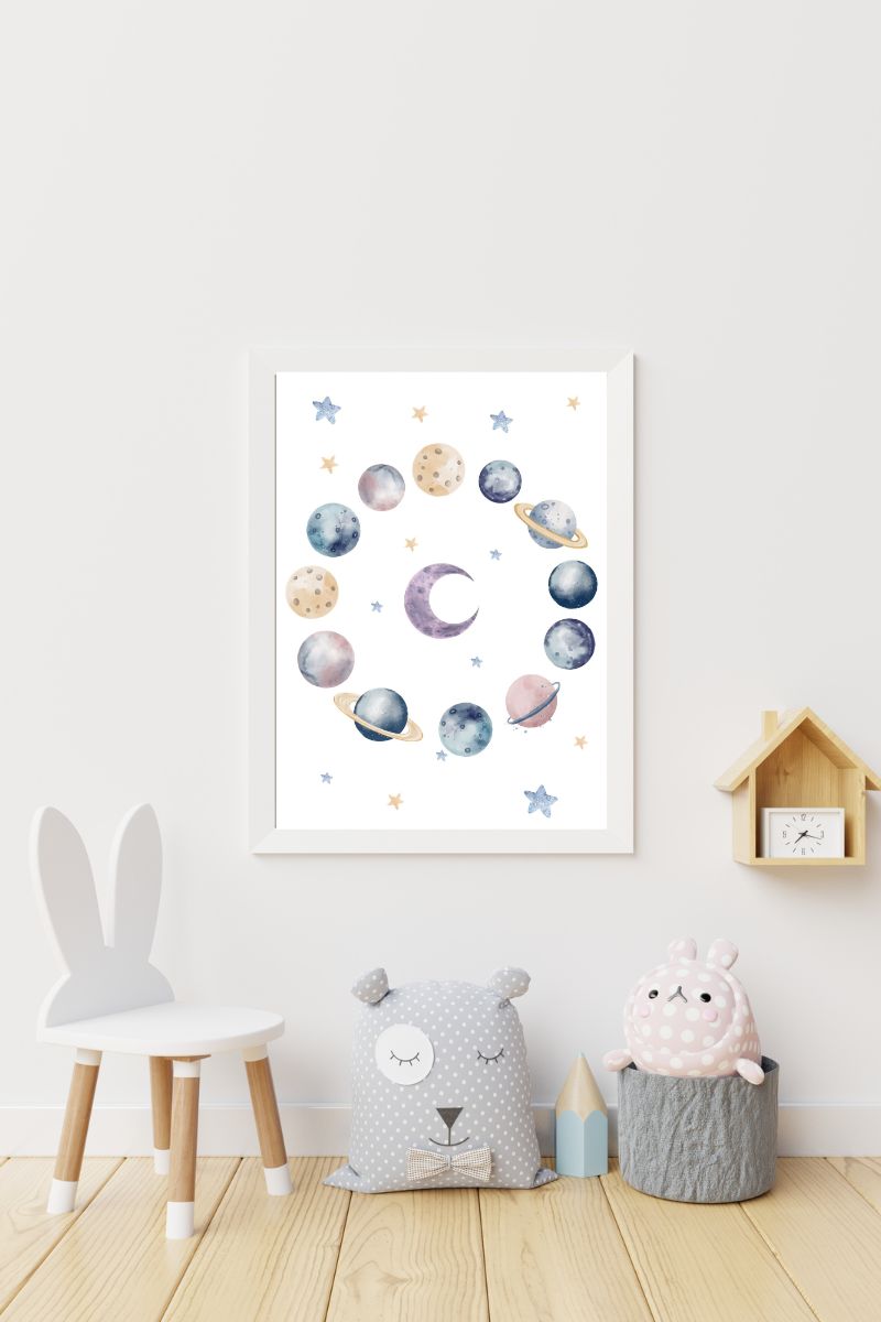 PEINTURE D’ENFANTS REPRÉSENTANT LE CROISSANT DE LUNE ENTOURÉ DES PLANÈTES