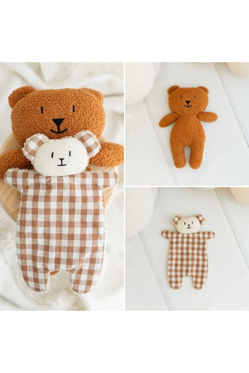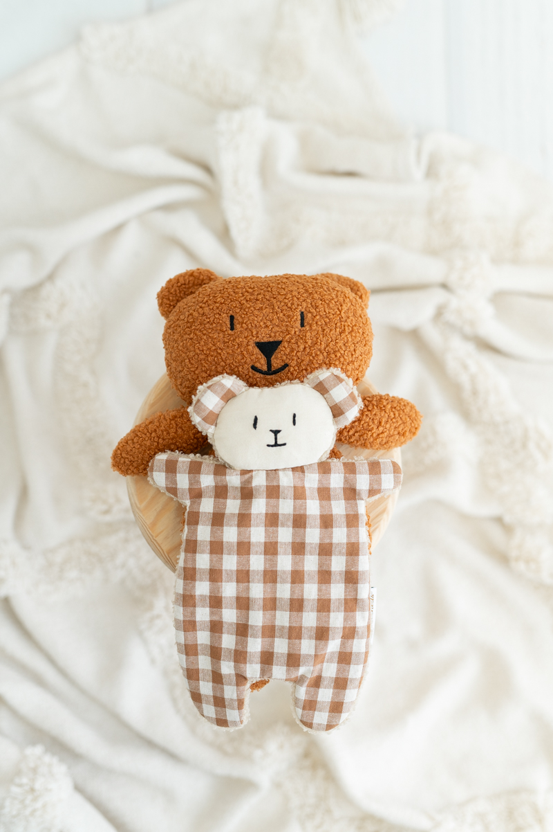 Este encantador doudou está fabricado con una combinación de tejido de algodón suave en estampado vichy y una parte trasera en tejido tipo borreguito, muy cálido y esponjoso. Todos los materiales son suaves, resistentes y aptos para el uso diario.