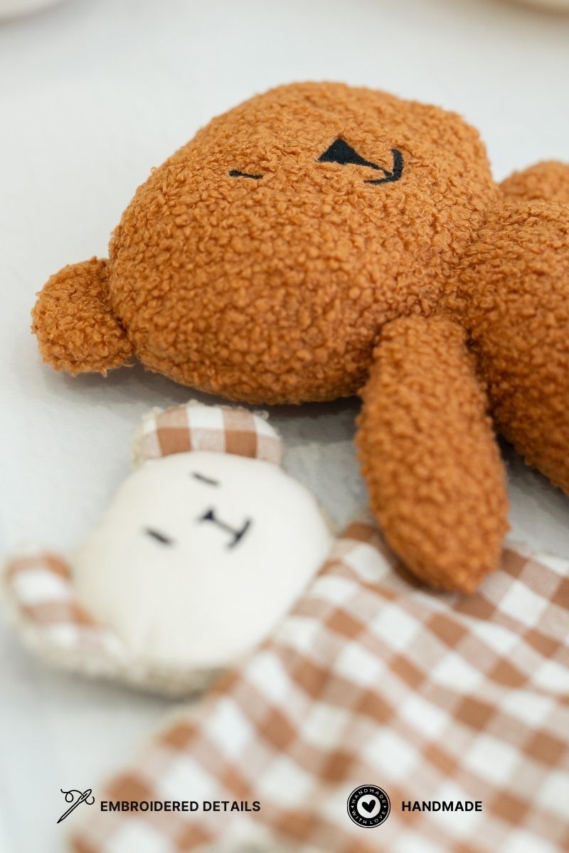 Este tierno osito de líneas simples y expresivas destaca por su estilo minimalista y delicado. Su color marrón aporta serenidad y combina a la perfección con la textura mullida del reverso. La mezcla de tela y borreguito crea un diseño atractivo y sensorial que invita al tacto, ideal para bebés y niños que buscan suavidad y calidez.