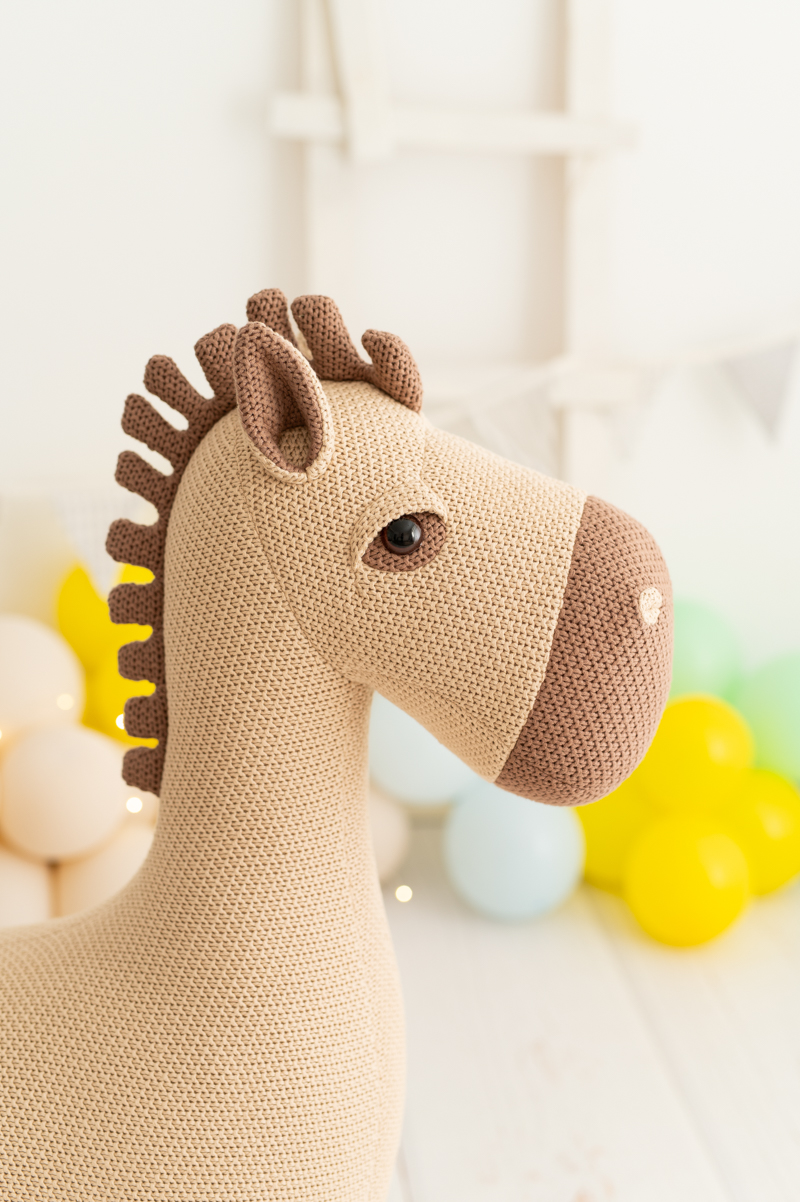 Descubre la ternura en su versión más grande del Peluche Caballo Maxi en color marrón de Algodón 100% natural, una creación artesanal única, tierna y segura de Crochetts®, diseñada para llenar de magia, diseño y naturalidad las habitaciones infantiles.