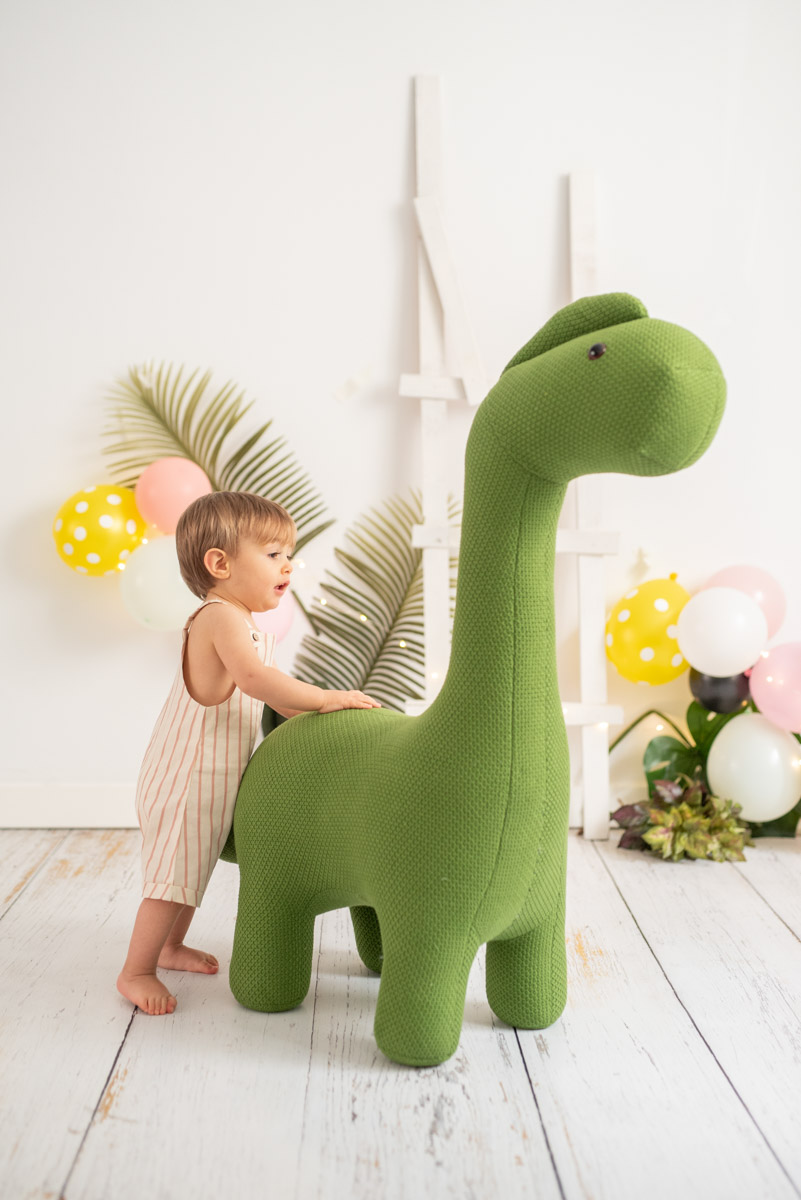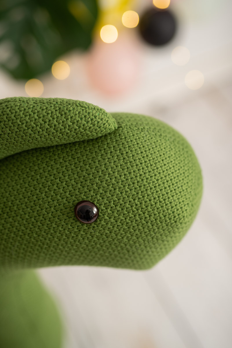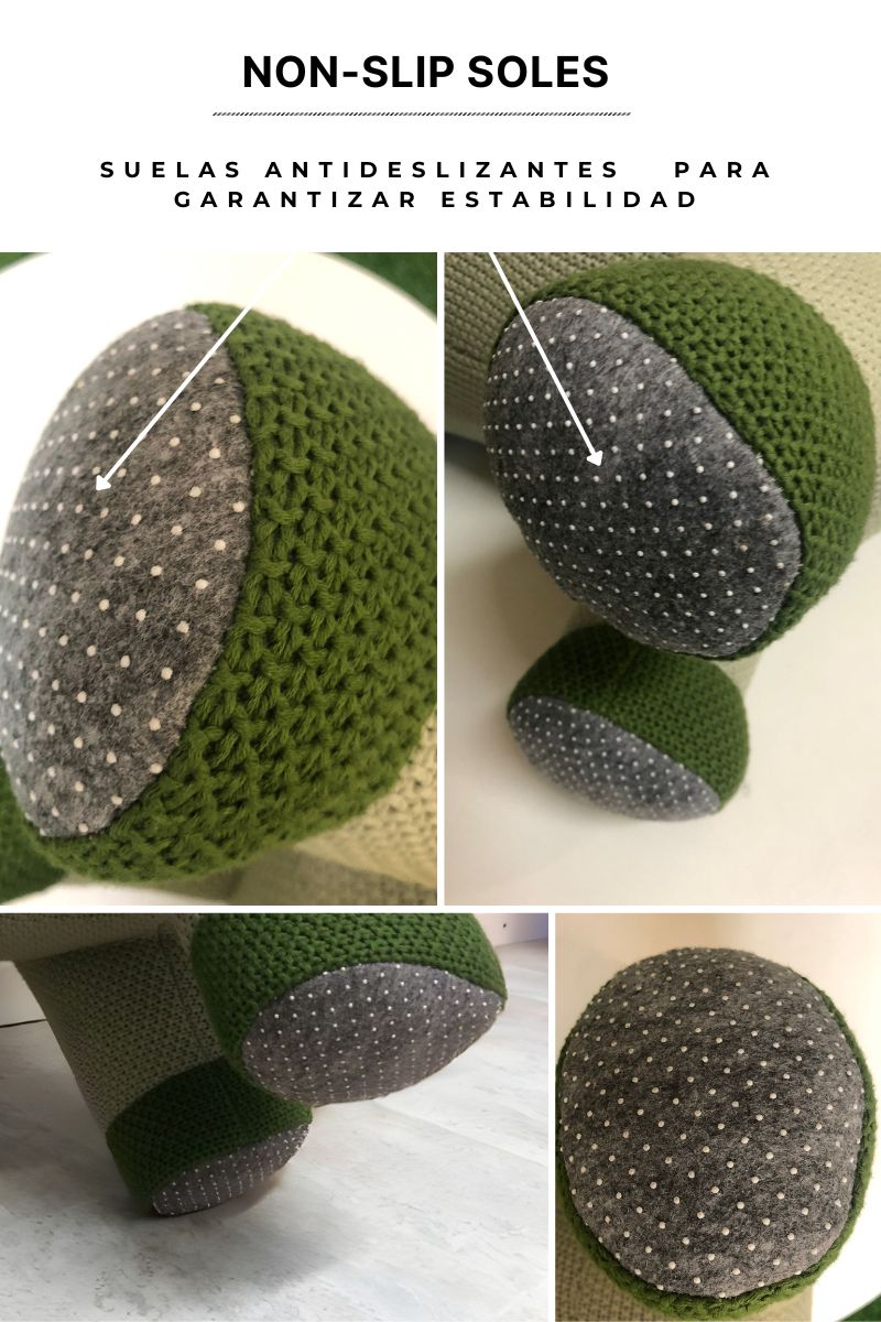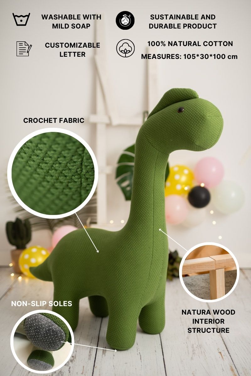 Su estructura interna de madera de pino soporta hasta 70 kg de peso encima, y las suelas antideslizantes en las patas garantizan estabilidad y seguridad. Perfecto como peluche decorativo XXL o asiento auxiliar, este dinosaurio verde de Crochetts aporta calidez y encanto a cualquier espacio infantil.