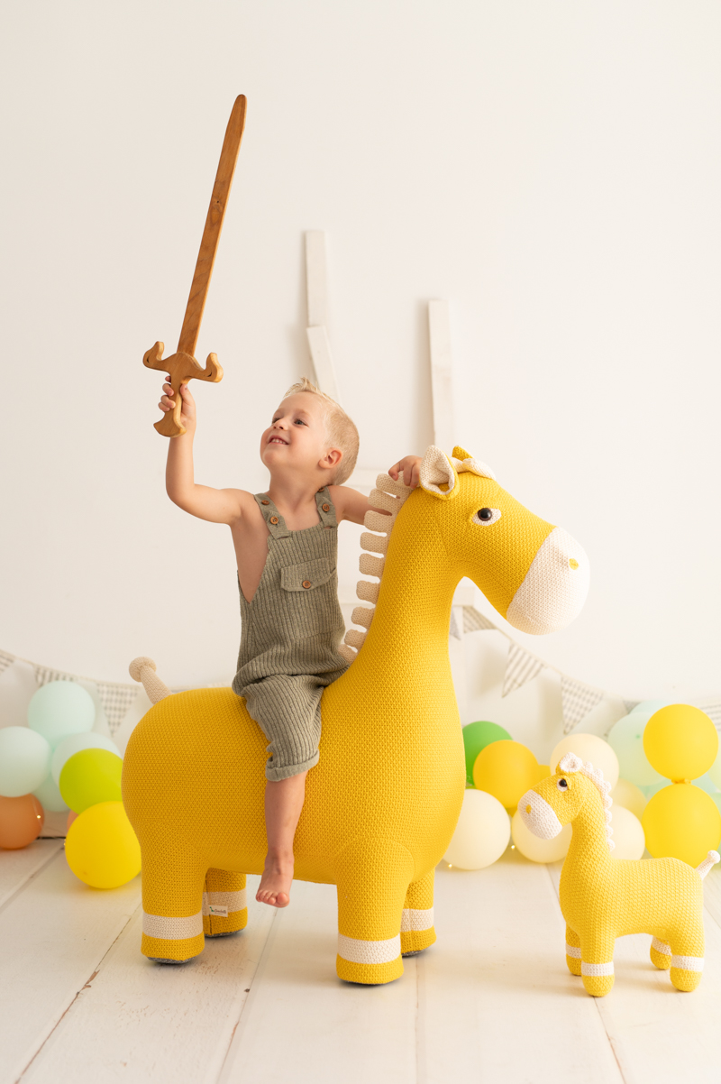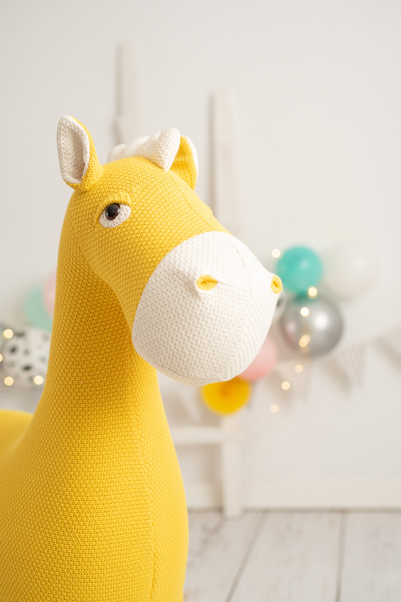 El alegre Peluche Caballo Joe de color amarillo no es solo un juguete: es una pieza de diseño artesanal que transforma cualquier habitación infantil en un espacio lleno de calidez y personalidad.