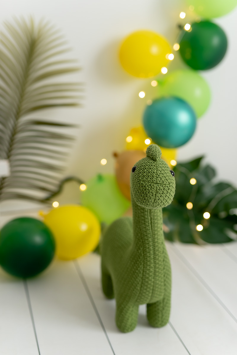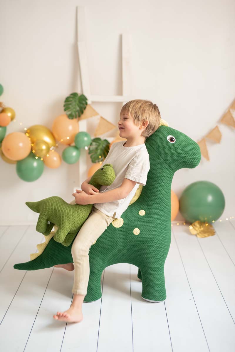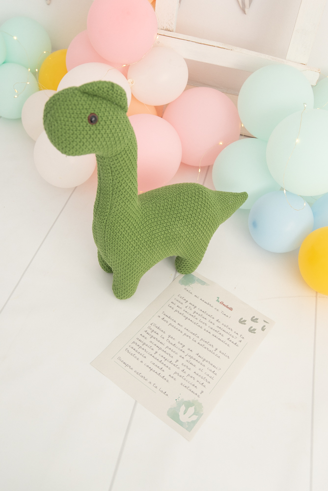 Cada dinosaurio está cuidadosamente fabricado con algodón orgánico de alta calidad y relleno hipoalergénico, asegurando comodidad y durabilidad. Su divertida cresta y detalles en crochet hacen de este peluche un compañero adorable y resistente.
