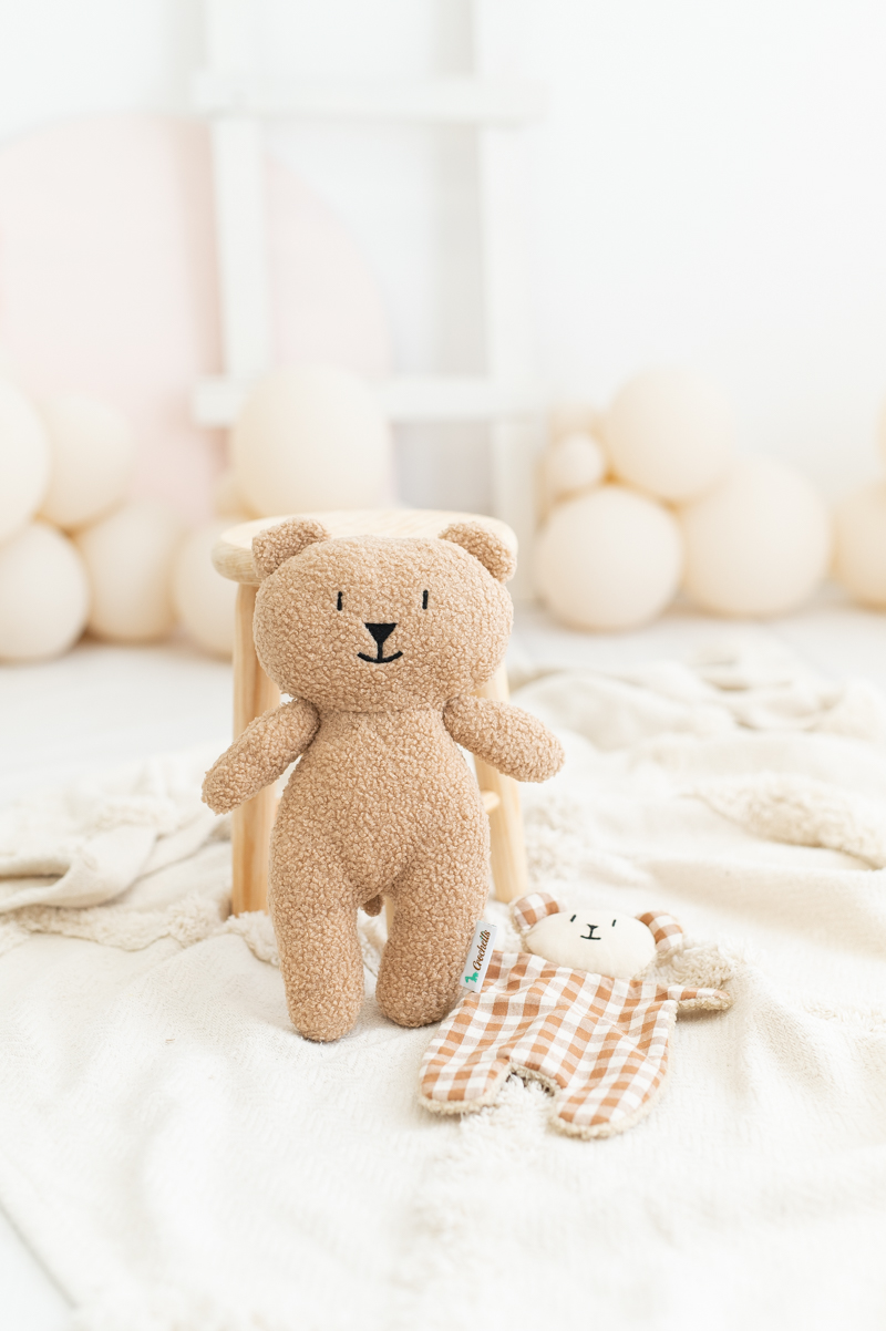 Este encantador osito de tela de rizo suave en color marrón claro ofrece una textura mullida y acogedora, ideal para abrazar y sentir seguridad.