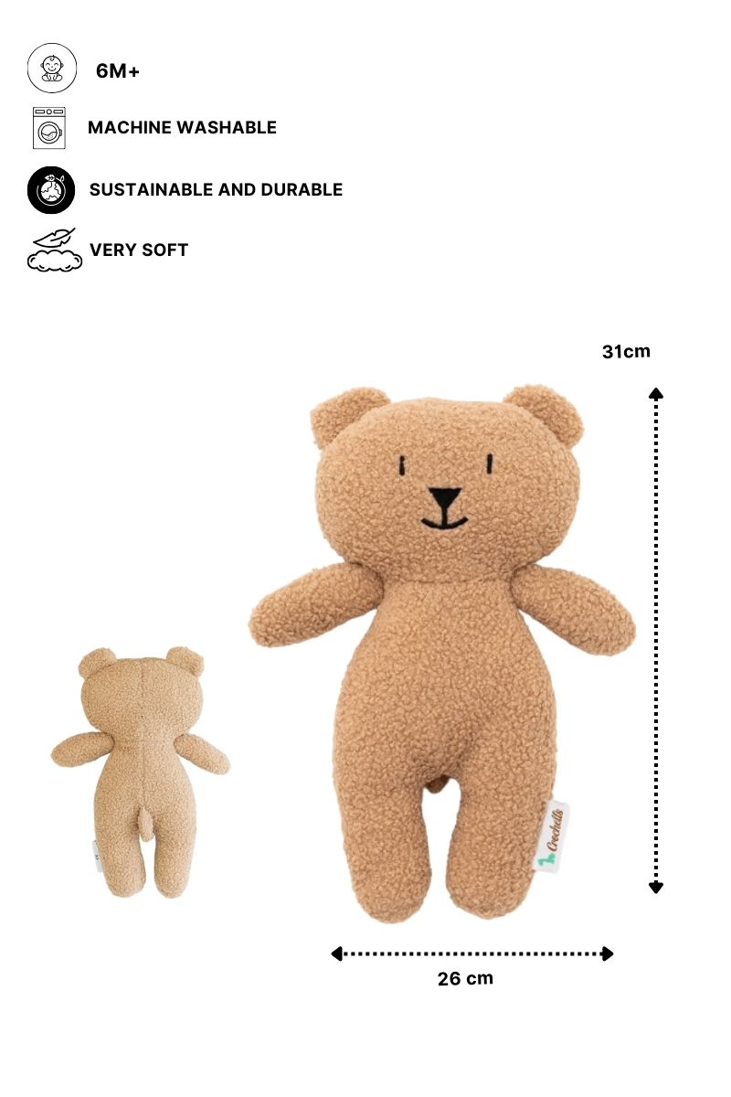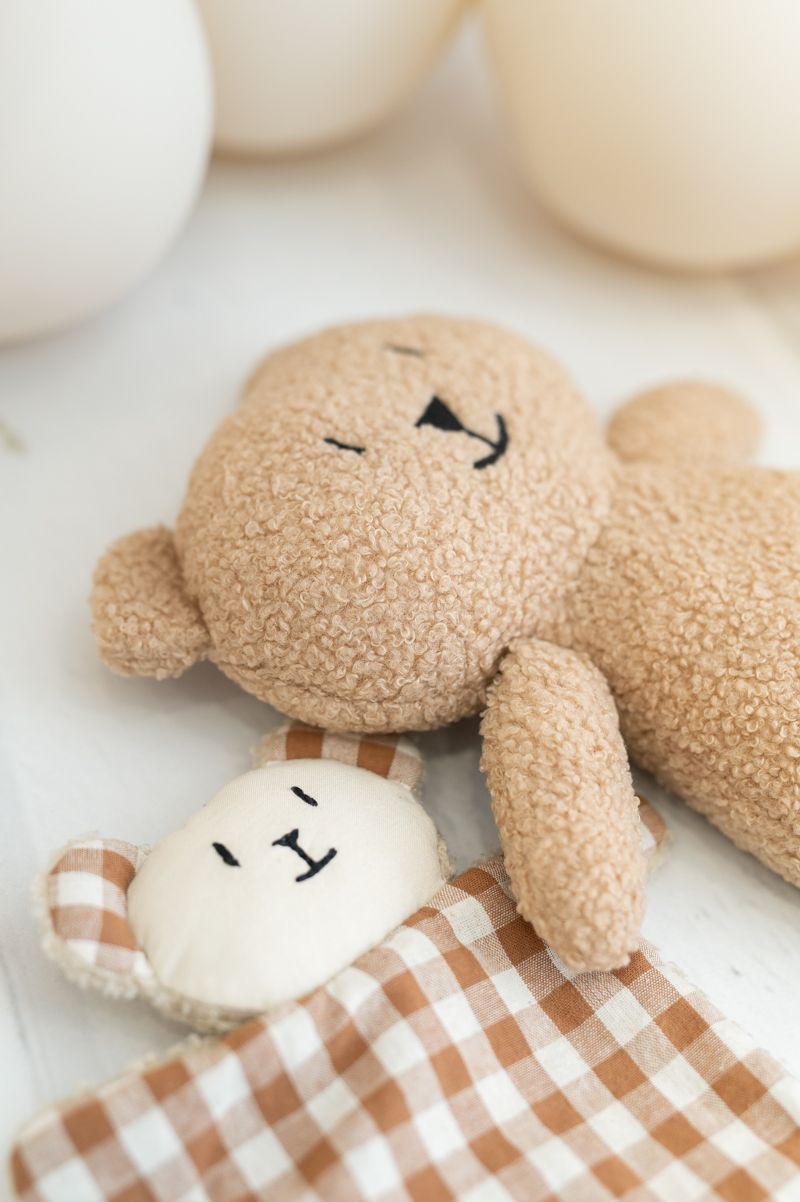 Teddy destaca por su textura ultrasuave tipo borreguito y su cuerpo blandito, perfecto como juguete de apego acompañando a tu bebé en el juego, la siesta o la hora de dormir, ofreciendo confort y seguridad.
