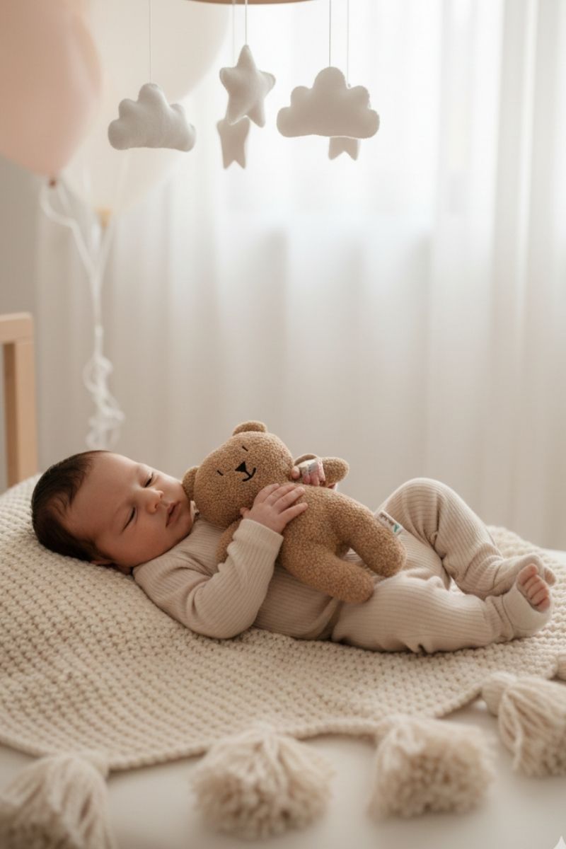 Nuestro Teddy tiene los ojos bordados para una máxima seguridad y está confeccionado sin costuras que puedan molestar, garantizando comodidad y protección para la piel delicada del bebé.