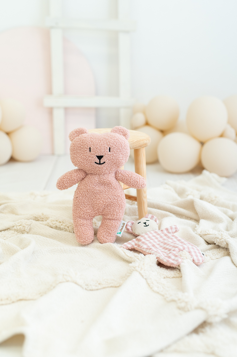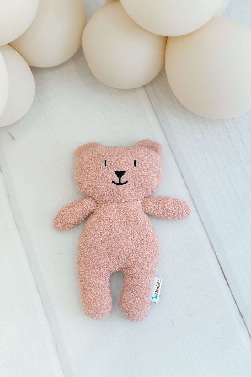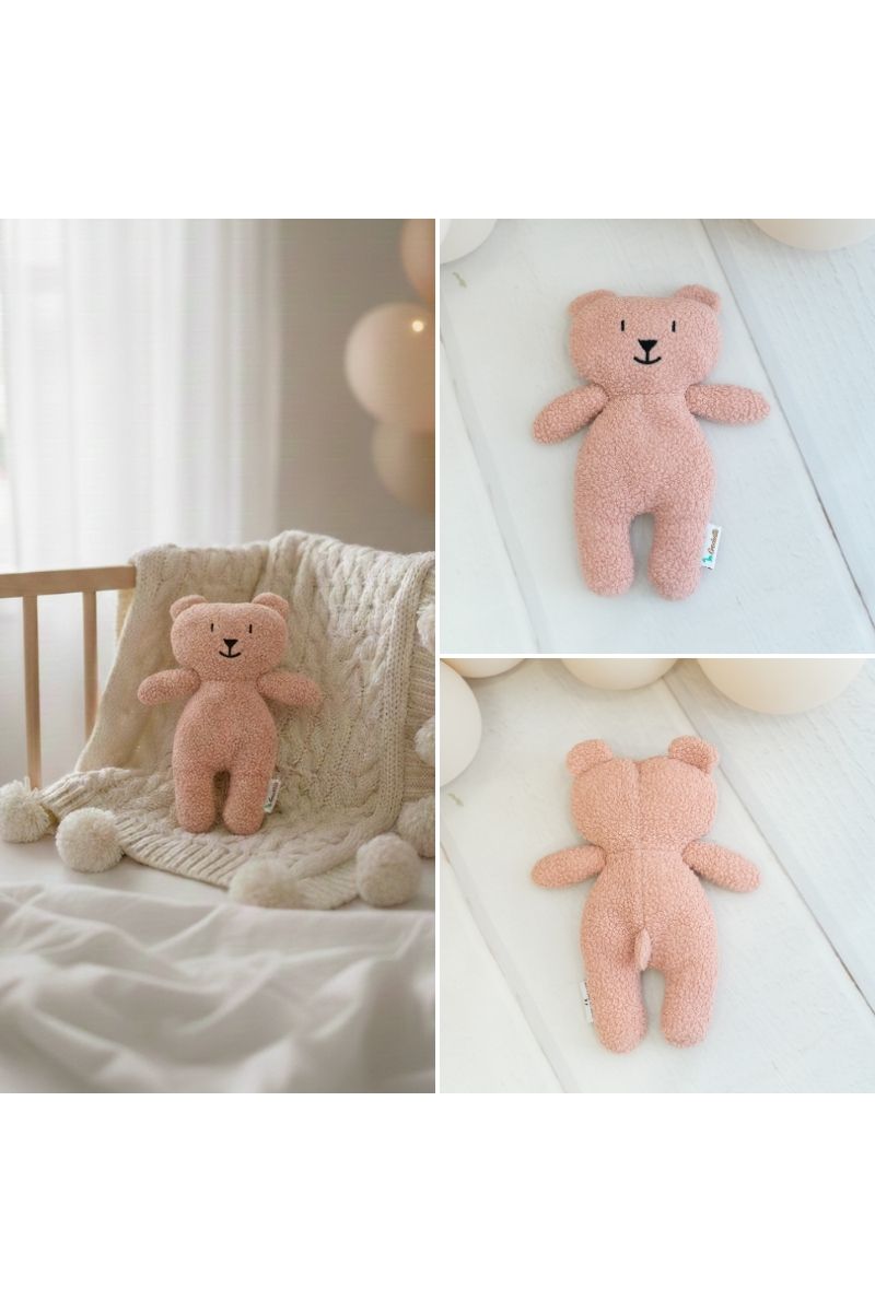 Este encantador osito de tela de rizo suave en color rosa ofrece una textura mullida y acogedora, ideal para abrazar y sentir seguridad.