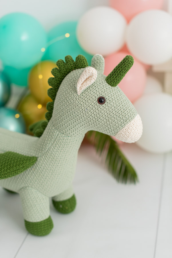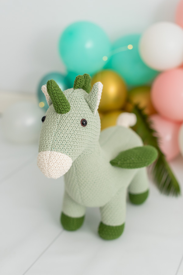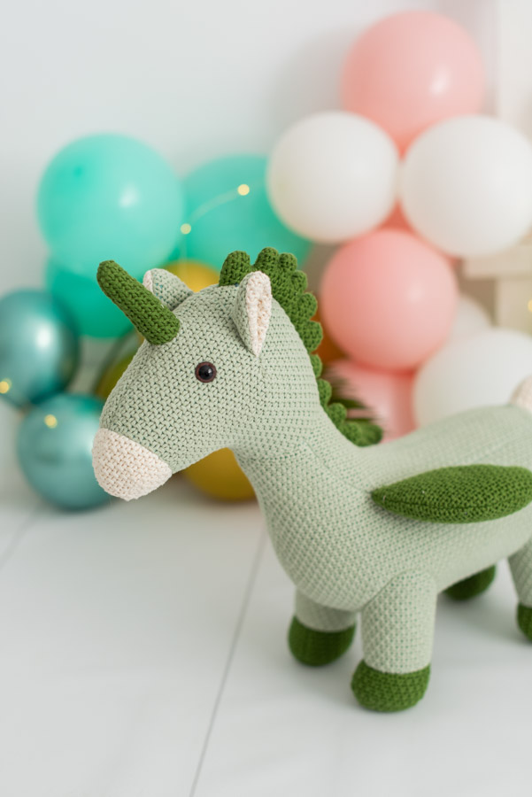 Cada pegasus está cuidadosamente fabricado con algodón orgánico de alta calidad y relleno hipoalergénico, asegurando comodidad y durabilidad. Su crin, alitas en color verde y detalles en crochet hacen de este peluche un compañero adorable y resistente.