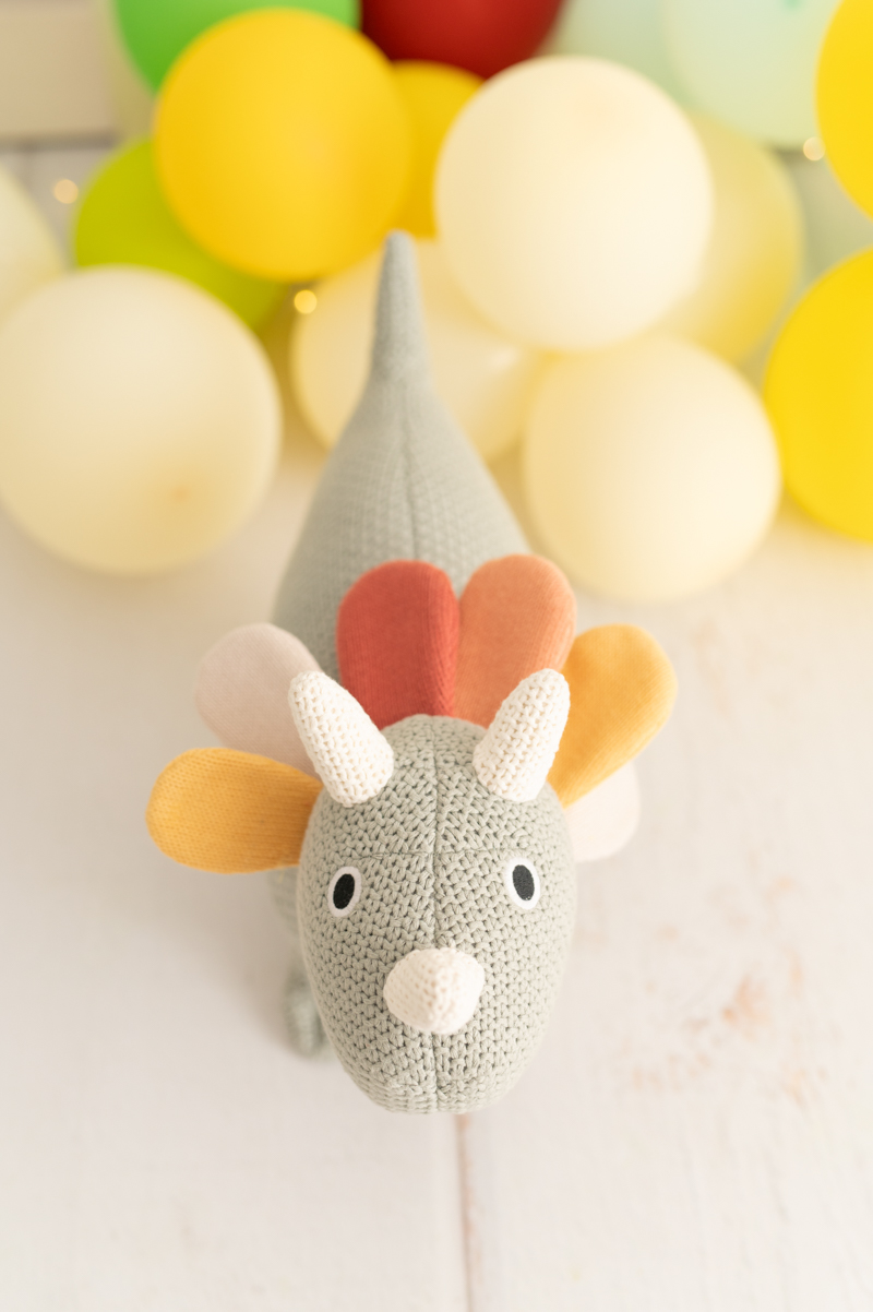 Descubre nuestro peluche triceraptus Brutush de crochet 100% algodón natural, un juguete artesanal ideal para bebés y niños pequeños. Este adorable peluche en forma de dinosaurio de algodón combina diseño, suavidad y sostenibilidad para acompañar en los mejores momentos de juego, descanso y ternura de los más pequeños.